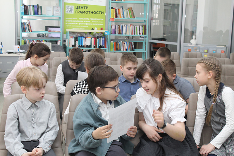 Третьеклассники попробовали составить свой рассказ по картинкам «Приключения военной собаки», прочитали не совсем обычно написанное письмо художника-фронтовика Бориса Федоровича Семенова, посмотрели мультфильм «Солдатская сказка». В заключение ребята вместе с ведущим провели совместный обзор по выставке, дополняя слова сотрудника библиотеки деталями, узнанными в ходе мероприятия.
