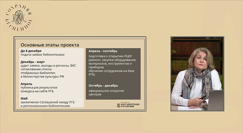 7 апреля для сотрудников региональных центров консервации и реставрации состоялся вебинар «Управление проектом: эффективное планирование». Вебинар провела Ольга Анатольевна Саломатина, начальник отдела комплексных проектов по сохранности Российской государственной библиотеки.