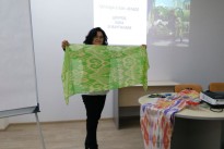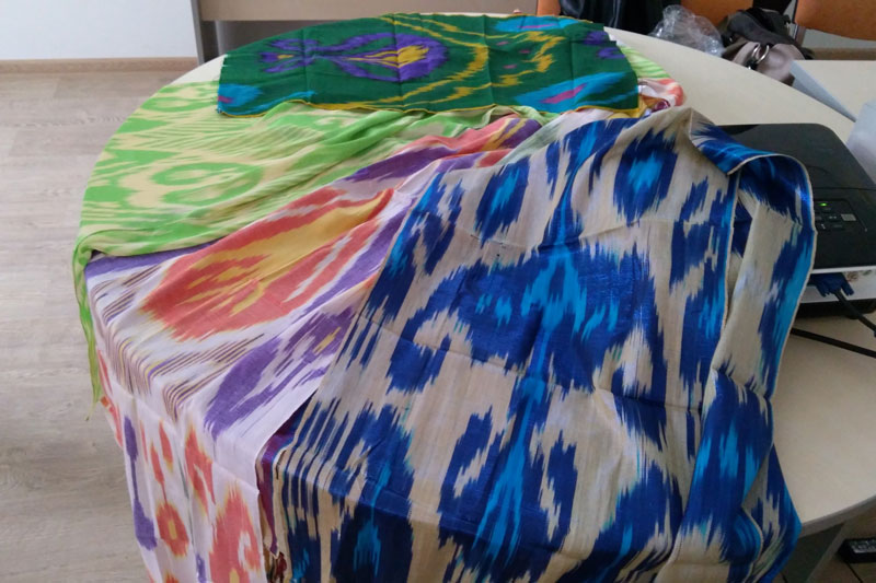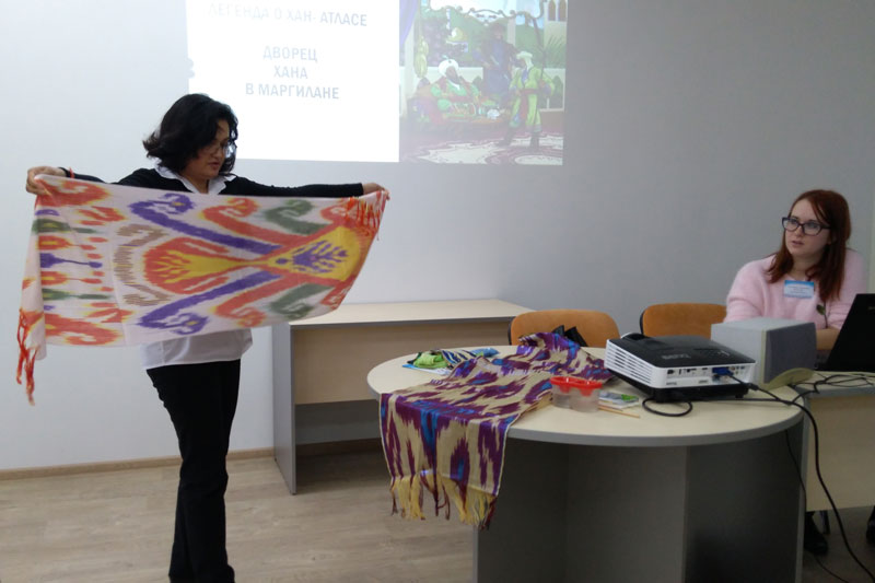 Мастер-класс начался с рассказа о возникновении знаменитой на весь мир узбекской ткани «хан-атласе». В рисунке этой ткани прослеживаются природа характера узбекского народа, его национальный художественный вкус. А цветовая палитра и шелковая фактура символизируют добросердечие, энергию и оптимизм. Хан-атлас является национальным достоянием узбекского народа.