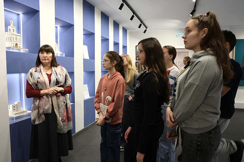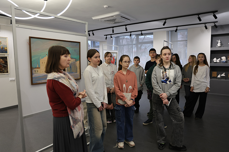 После этого обучающиеся ознакомились с экспозицией, где представлено более 100 работ живописи, архитектурных моделей, кукол и кружева от рязанских художников и студентов творческих специальностей. Участники обратили внимание на то, как авторы по-разному воплощали одинаковые технические задания, следуя канонам искусства, а также своему видению и восприятию.