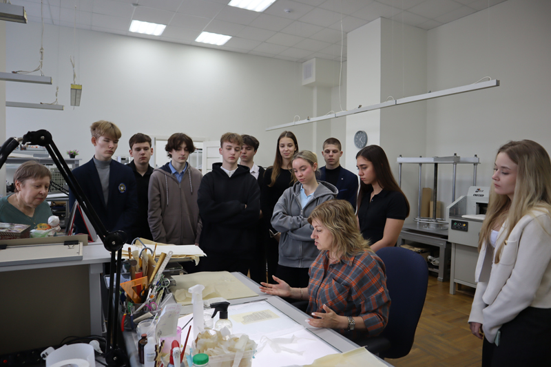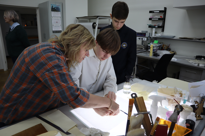 Школьники смогли попробовать свои силы в реставрационных процессах, рассмотрели структуру бумаги под микроскопом. Экскурсия позволила юным гостям оценить всю сложность и важность профессии реставратора.