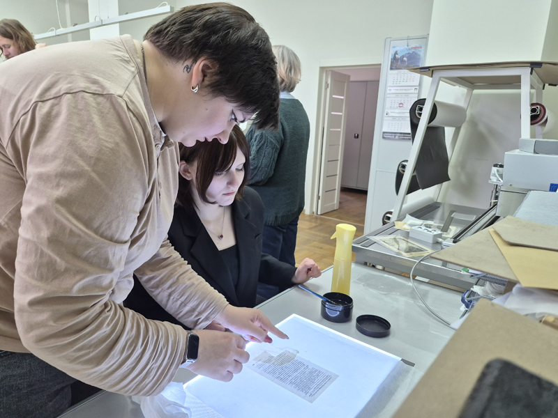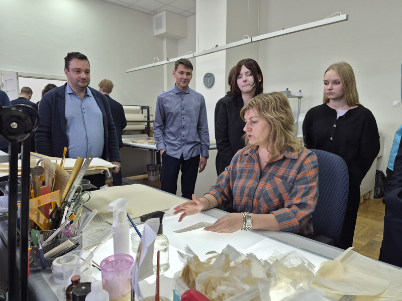 В ходе экскурсии они познакомились с многоэтапной работой по сохранению книжного наследия: от диагностики и очистки поврежденных документов, включая промывку листов, до классической листовой реставрации и реставрации переплетов. Специалисты центра также объяснили принципы превентивной консервации, рассказали об изготовлении специальных контейнеров из бескислотного картона и защитных капсул для документов.