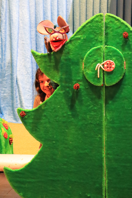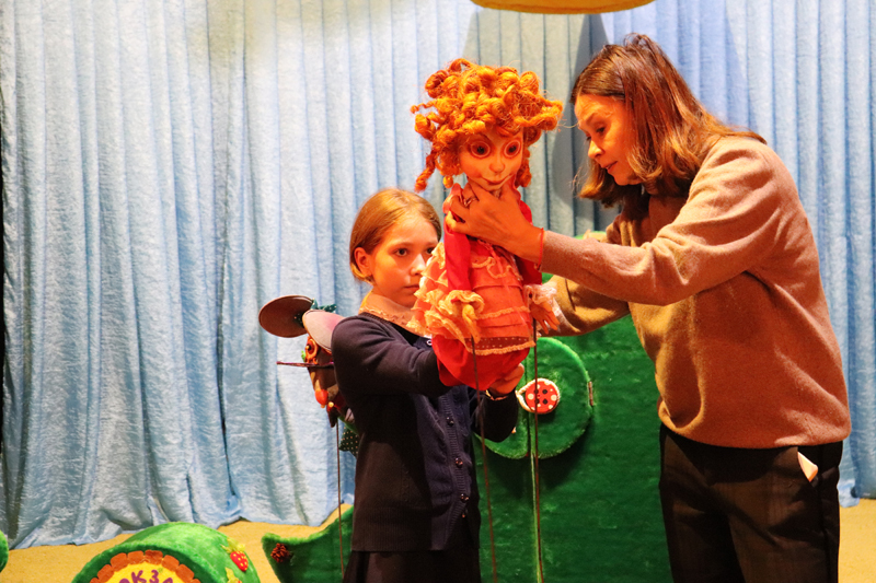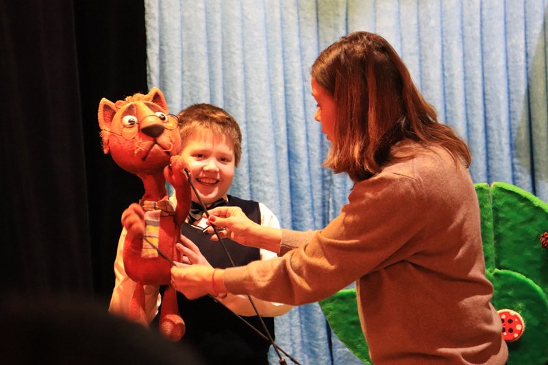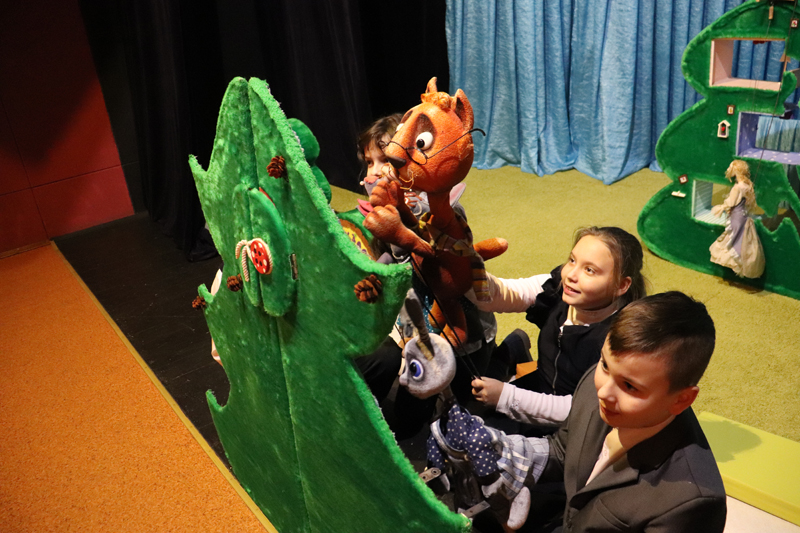 Гости театра познакомились с разными видами профессиональных кукол и системами их управления. Кукла-марионетка приводится в движение при помощи нитей. Конструкция куклы перчаточного типа состоит из головы на пальце и перчатки на руке кукловода. Гапитно-тростевые куклы приводят в движение с помощью трости, на которую надета кукла. Планшетные куклы умеют ходить по полу, по настилу сцены, который называется в театре «планшет». Все дети попробовали себя в роли кукловодов. За сценой ребята увидели пульт управления помощника режиссера. Всех очень удивила сложность механизмов, обеспечивающих техническое оснащение спектаклей.