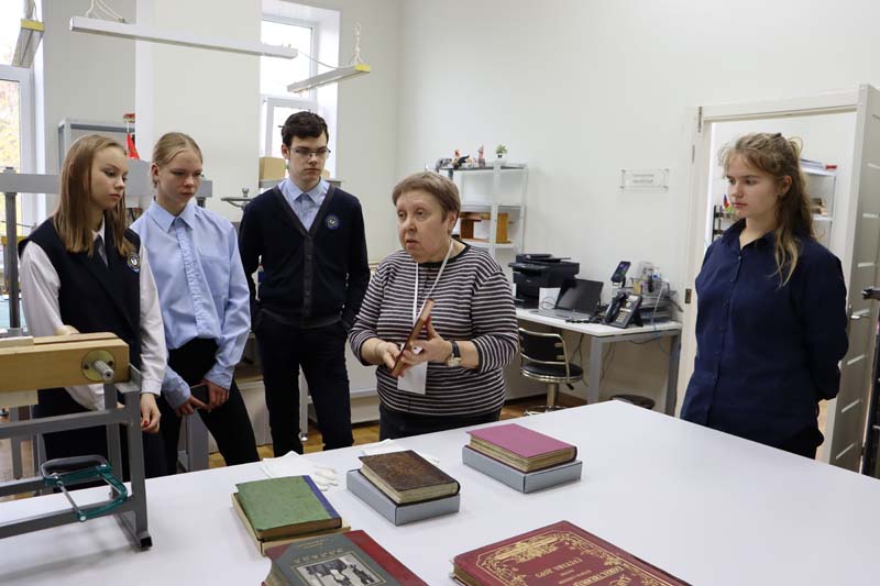 Художники-реставраторы продемонстрировали приемы классической листовой реставрации и восстановления переплетов, познакомили с процессом переплета книг массового спроса, показали отреставрированные книги. Специалисты по превентивной консервации рассказали учащимся об изготовлении контейнеров из бескислотного картона для предохранения книг от воздействия окружающей среды; капсул из специальной полиэфирной пленки для хранения листовых документов.