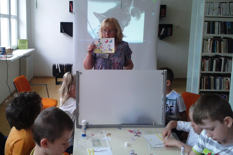 Много интересного о наших любимцах ребята узнали из рассказов библиотекарей. Дети посмотрели отрывки из мультфильмов «Котенок по имени Гав» и «Приключения кота Леопольда», с удовольствием рассказали о своих кошках, перечисляя их забавные повадки, отмечая лучшие черты характера. Всех мальчишек и девчонок заинтересовали конкурсы «Что любит моя кошка» и «Дорисуй кота». В заключение мероприятия ребята сделали аппликацию «Кошка с котенком». Открытки получились яркими и веселыми.
