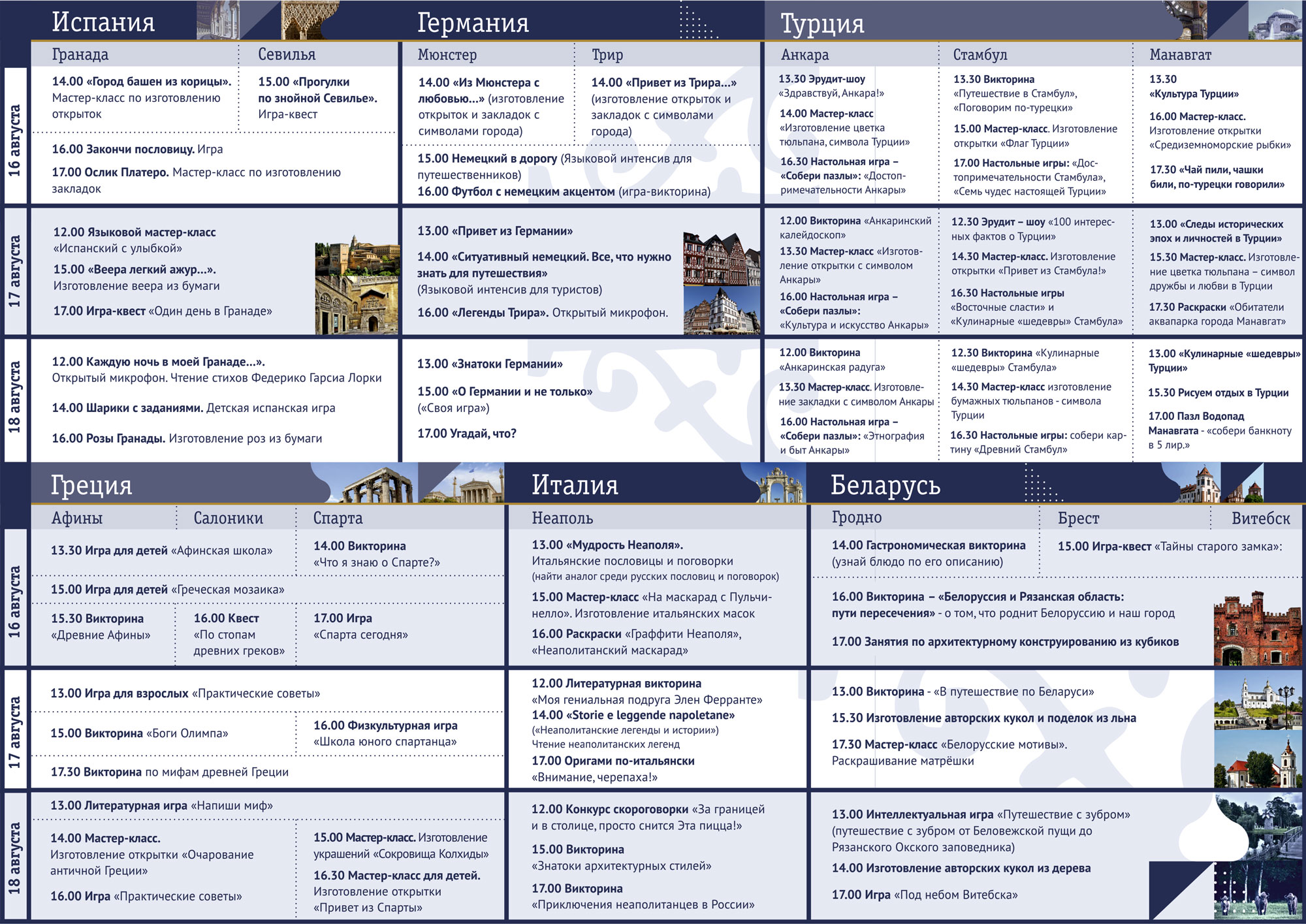 «Посольства» начнут работу 16 августа в 12.00 на Лыбедском бульваре. Гости Форума смогут их посетить с 12.00 до 18.00 в течение трех дней – 16, 17, 18 августа. Будут представлены 23 «Посольства» и 48 городов, для посетителей подготовлена насыщенная и интересная программа из 187 мероприятий. Кулинарные конкурсы значительно обогатят меню рязанцев и гостей областного центра; языковые интенсивы помогут освежить знания немецкого, турецкого, испанского языков; эрудит-шоу позволят блеснуть знаниями по истории и искусству России, Беларуси, Италии, Испании, Германии, Узбекистана, Болгарии, Греции, Турции, Китая.