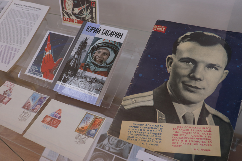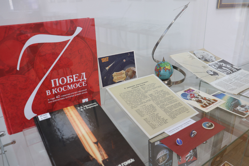 В экспозиции представлены издания из фонда библиотеки им. Горького, среди которых особый интерес вызывают прижизненные издания нашего земляка, выдающегося русского изобретателя и теоретика космонавтики Константина Эдуардовича Циолковского, письмо депутата Верховного Совета СССР Юрия Алексеевича Гагарина с его автографом, а также периодические издания 1961 года, повествующие о знаменательном событии – первом полете человека в космос. Яркие достижения советской космонавтики нашли свое отражение в плакатах 50 – 60-х годов прошлого века.