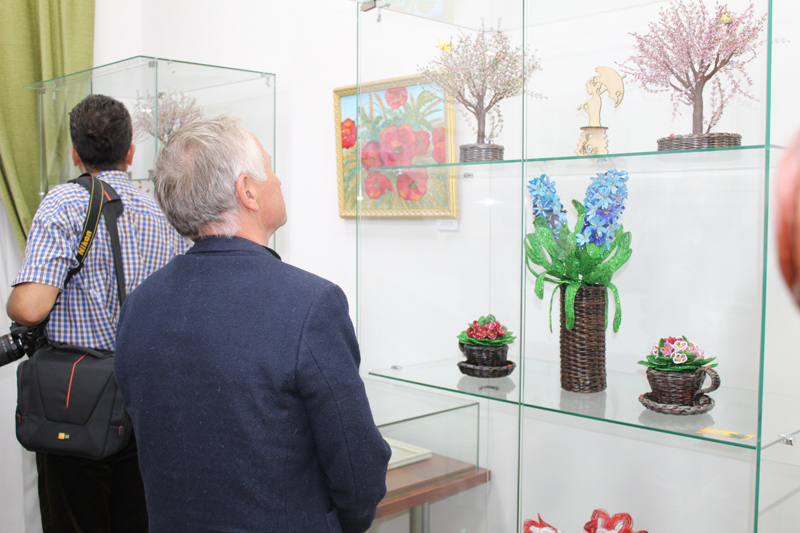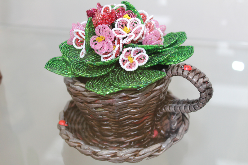 По цвету перекликаются с живописью Ольги Такижбаевой искусные работы из бисера, выполненные Валентиной Пономаревой, уроженкой г. Сасово Рязанской области. На выставке экспонируется 19 работ мастера; среди них родные русские березки и елочки, японские сакуры, загадочные, причудливой формы цветы. Все изделия выполнены из чешского бисера и переливаются радугой ярких цветов.