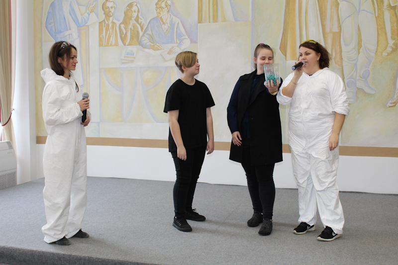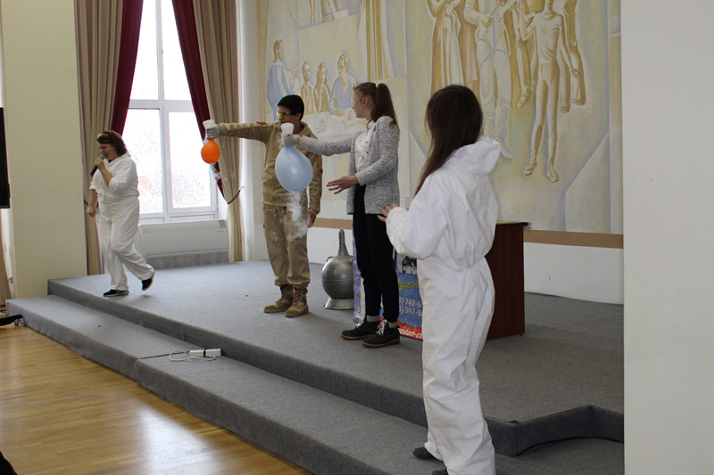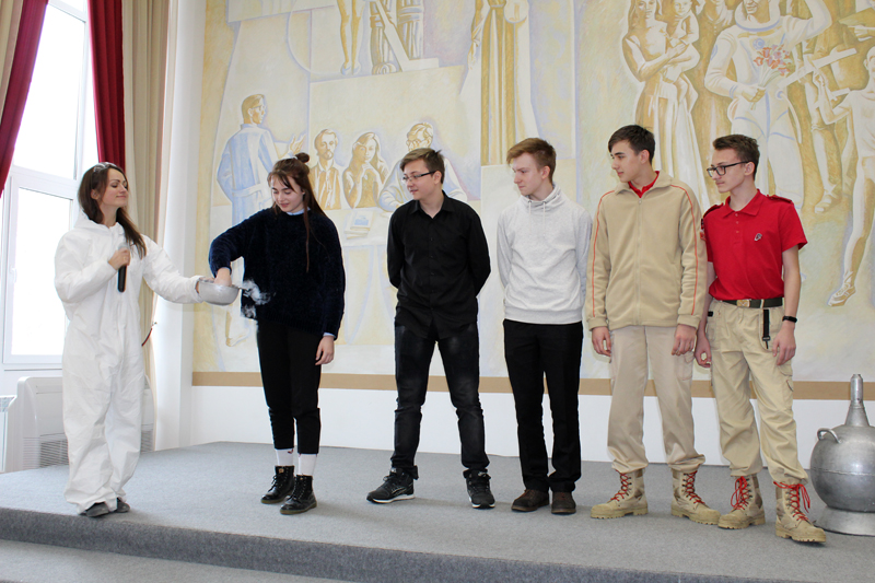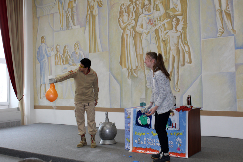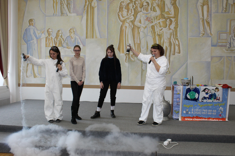 Учащиеся с интересом слушали рассказ и смотрели фрагменты из документальных фильмов о незаурядной личности. Научно-познавательным дополнением программы стало увлекательное представление от рязанской команды «Чемодан чудес». Шоу-магистры заинтересовали ребят зрелищными опытами по химии, превратив эту встречу в волшебство.