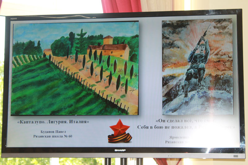 Во время встречи победителям и участникам конкурса сочинений и рисунков, проведенного библиотекой, были вручены грамоты и книги издательства «Гелиос». Первое место в конкурсе сочинений заняла ученица 5 «В» класса школы-интерната имени Героя Советского Союза, Национального Героя Италии Ф.А. Полетаева Надежда Заборова, в конкурсе рисунков – студентка Рязанского медицинского колледжа Фаина Афонина. Благодарственные письма получили преподаватели семи школ, Рязанского медицинского колледжа и школы-интерната. Во время награждения на экране демонстрировались сканы конкурсных рисунков.