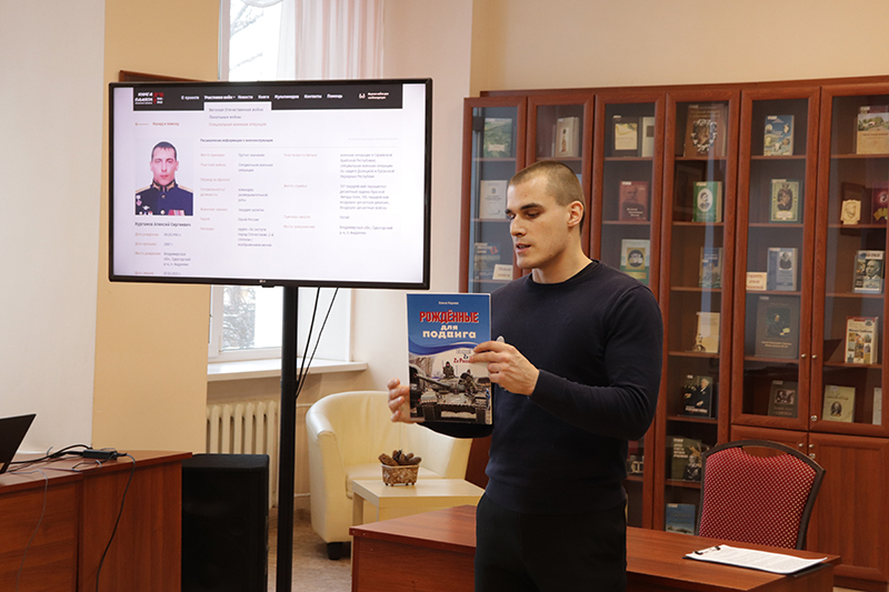 Дмитрий Андреевич рассказал об истории сайта «Книга Памяти Рязанской области», его структуре и ресурсах, объяснил, как по QR-коду, имеющемуся на каждой странице, можно перейти к документам, фотографиям, воспоминаниям, видеоматериалам. У ребят была возможность ознакомиться с самой «Книгой Памяти» и книгой «Солдаты Победы», а также с изданиями об участниках локальных войн и «Книгами памяти» малых населенных пунктов. Прозвучало и то, что будет создана «Книга Памяти», посвященная участникам специальной военной операции, а в настоящее время уже подготовлена книга члена Союза журналистов России Елены Алексеевны Каревой «Рожденные для подвига» о рыбновцах, участниках СВО, погибших при выполнении воинского долга.