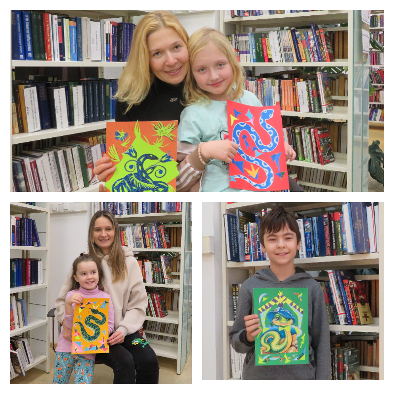 Наступивший год под знаком Змеи участники клуба выходного дня «Домовенок» встретили за выполнением декоративного панно в технике коллажа с изображением веселой змейки.