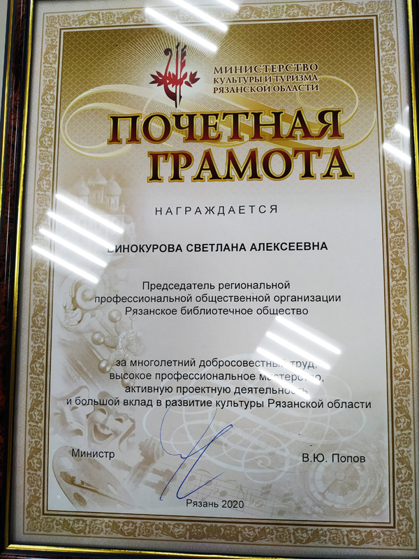 Рязанская библиотека имени Горького от всей души поздравляет своих сотрудников: заместителя директора Светлану Алексеевну Винокурову, получившую Почетную грамоту министерства культуры и туризма, и заведующую отделом культурных программ и коммуникаций Дарью Фролов, получившую Благодарность министра культуры и туризма Рязанской области. Так держать!