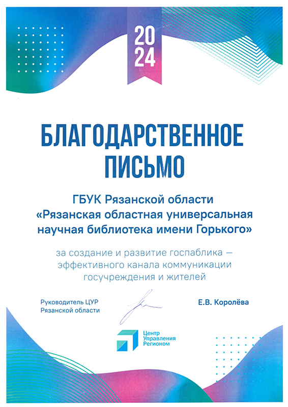 Отличившимся в работе администраторам пабликов вручили дипломы и благодарности. Наша библиотека была отмечена благодарственным письмом Центра управления регионом «За создание и развитие госпаблика – эффективного канала коммуникации госучреждения и жителей», а заведующая отделом информационных коммуникаций «Горьковки» Оксана Мудрова получила благодарственное письмо Комитета по информации и массовым коммуникациям Рязанской области «За оперативное и качественное освещение региональной повестки в социальных сетях и распространение социально значимой информации среди жителей региона».
