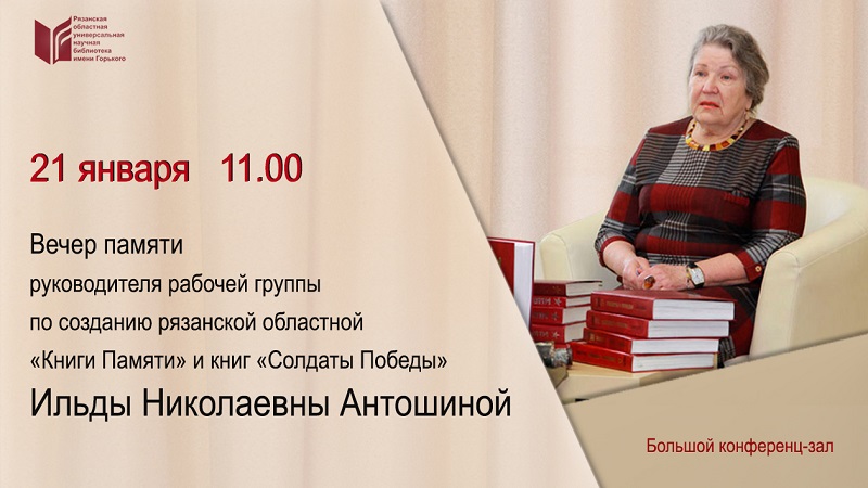 21 января в Большом конференц-зале библиотеки состоялся Вечер памяти руководителя рабочей группы по созданию областной «Книги Памяти» и книг «Солдаты Победы» Ильды Николаевны Антошиной, приуроченный к годовщине ее ухода из жизни.