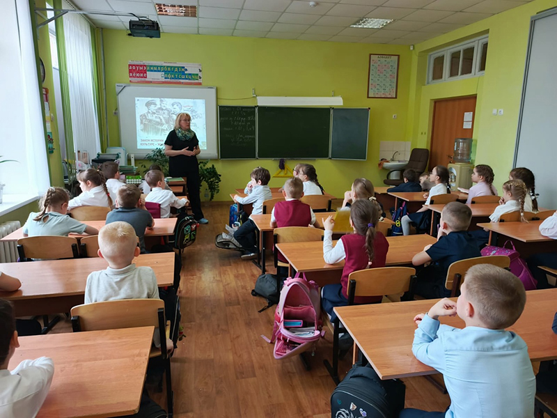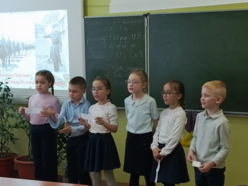 Хочется добавить, что воспитание патриотических чувств у ребят проходит в тесной связи с педагогами школы, поэтому дети уже с первого класса могут исполнить «Катюшу» и «Смуглянку», легко выступить с фронтовыми частушками перед классом, вести активный диалог на исторические темы.