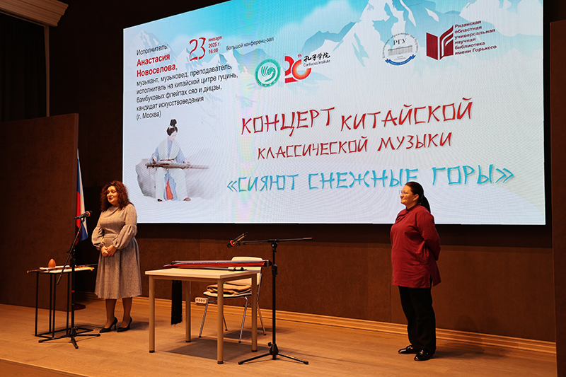 Ярким продолжением события стал концерт китайской классической музыки «Сияют снежные горы». Представитель научно-творческого центра «Музыкальные культуры мира» Московской государственной консерватории имени П.И. Чайковского, музыковед, преподаватель Анастасия Новоселова познакомила рязанцев с лучшими образцами китайского традиционного музыкального искусства. Она исполнила классические и современные произведения на цитре гуцинь, бамбуковой флейте сяо и окарине сюнь. Анастасия Новоселова сопроводила свое выступление комментариями к исполняемым пьесам и используемым инструментам. Концерт вызвал неподдельный интерес зрителей, которые продолжили общение с исполнительницей после выступления.