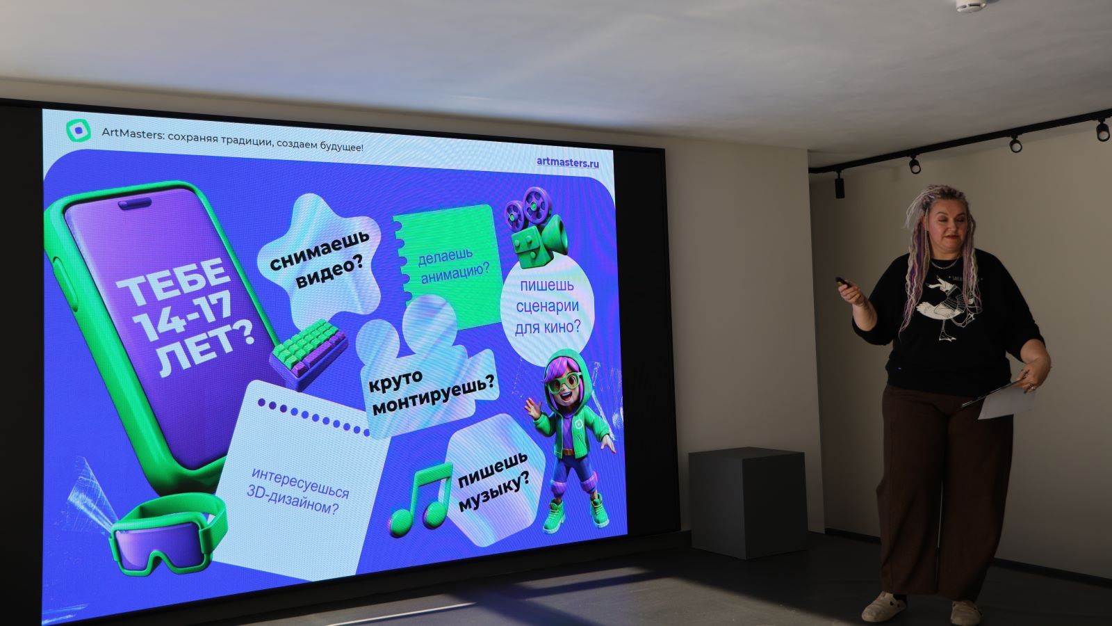 В первый день интенсива педагог Школы креативных индустрий, эксперт и наставник федеральных конкурсов Анна Бурукина вместе с учениками обсудила основные принципы успешной самопрезентации. Ребята размышляли о том, как их видят другие люди, и узнали эффективные техники управления первым впечатлением.