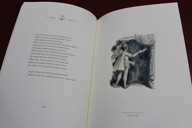 Строки сонетов сопровождены прекрасными иллюстрациями художницы Яны Игоревны Половинкиной, созданными специально для этого издания. Благодаря высоким технологиям, оригиналы иллюстраций воспроизводятся в книге в точности, что подтверждается подписью художника. Книга вышла ограниченным тиражом 58 экземпляров.
