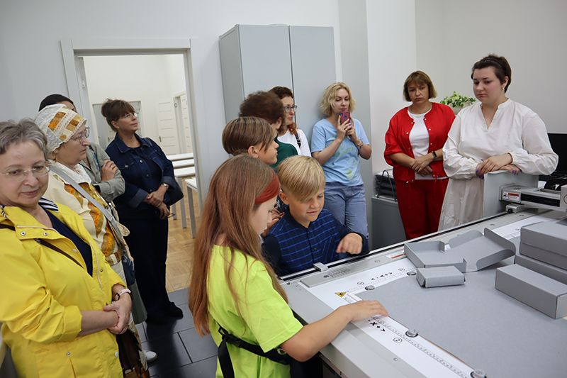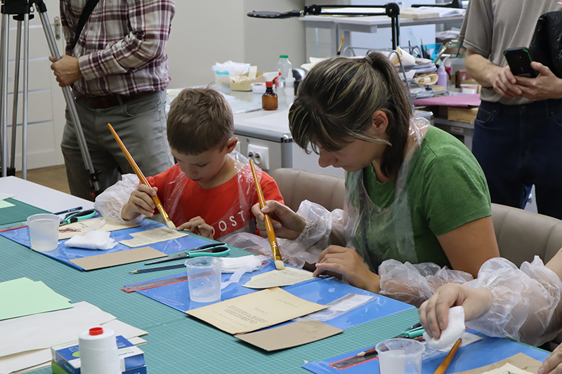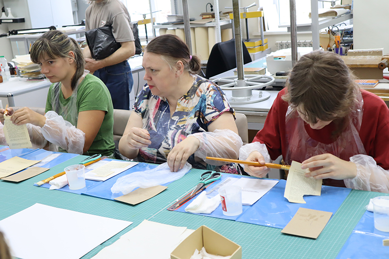 В ходе мастер-классов специалисты провели обзорную экскурсию по центру и показали участникам полный цикл реставрационных работ по восстановлению бумажных документов: обследование документа, механическую и водную очистку, укрепление разрывов и восполнение утрат бумажной основы на реставрационном столе с подсветом.