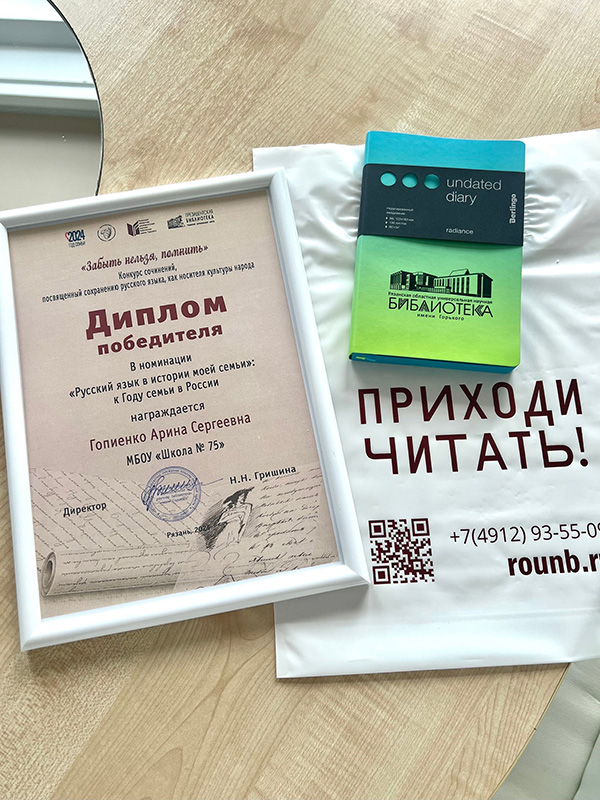 – в номинации «Русский язык в истории моей семьи»: к Году семьи в России – Арина Гопиенко, школа № 75, г. Рязань.