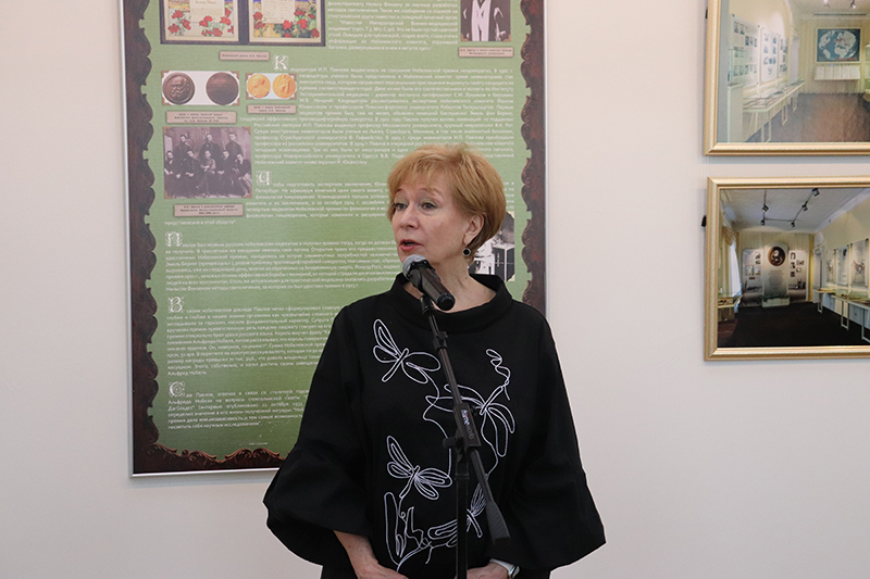 Главный хранитель Мемориального музея-квартиры академика И.П. Павлова в г. Санкт-Петербурге, старший научный сотрудник Института физиологии имени И.П. Павлова РАН Юлия Андреевна Кораблина выступила с приветствием онлайн. Она поблагодарила организаторов выставки и пожелала всем, кто чтит память об И.П. Павлове, «продолжать работу по увековечению имени славного сына русской земли и великого подвижника науки».
