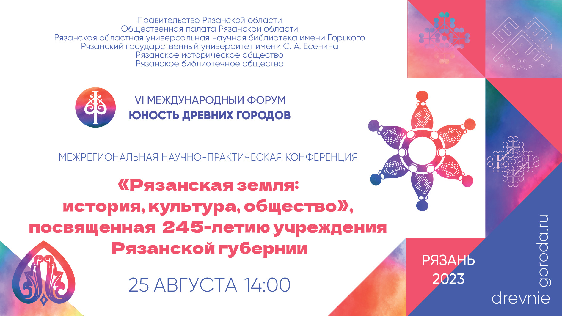 25 августа 2023 года в 14.00 в Рязанской областной универсальной научной библиотеке имени Горького в рамках VI Международного форума "Юность древних городов" состоится IX межрегиональная научно-практическая конференция «Рязанская земля: история, культура, общество», посвященная 245-летию учреждения Рязанской губернии.