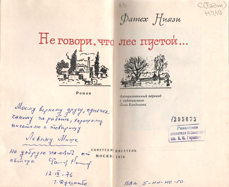 В фонде Рязанской библиотеки имени Горького хранятся книги Фатеха Ниязи с автографом автора. На титульном листе книги «Не говори, что лес пустой» Ниязи написал: «Моему верному другу, однополчанину по работе, хорошему писателю и товарищу Левину Мише на добрую память от автора. 12. 03. 76. г. Душанбе». На форзаце книги «Верность» дарственная надпись: «Дорогому другу, верному товарищу Мише Левину с братским рукопожатием от верного Фатеха. 20. 1.63. г. Душанбе». Дарственные надписи адресованы Левину Минелю Иосифовичу (1925-2010) – русскому прозаику, поэту, публицисту. М. Левин подарил эти книги нашей библиотеке.