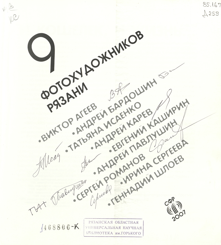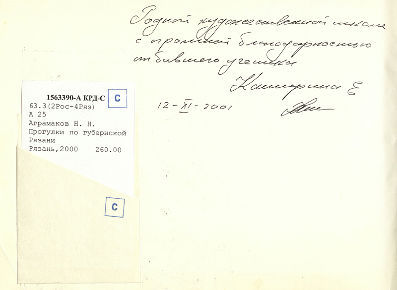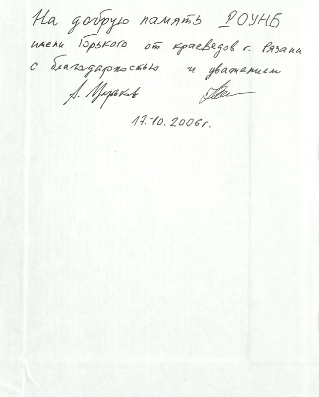 В фонде нашей библиотеки имеются книги с автографом Евгения Каширина. На его совместном с Н. Аграмаковым сборнике «Прогулки по губернской Рязани» Евгений Николаевич Каширин написал: «Родной художественной школе с огромной благодарностью от бывшего ученика Каширина Е.». На книге А. Царькова и Е.Каширина «Имя в истории земли Рязанской» автограф, адресованный непосредственно нам: «На добрую память РОУНБ имени Горького от краеведов г. Рязани с благодарностью и уважением». На фотоальбоме «9 фотохудожников Рязани» среди прочих также имеется автограф Евгения Каширина.
