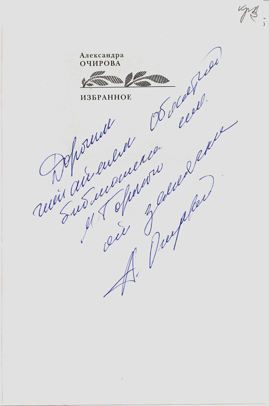 В фонде Рязанской библиотеки имени Горького в «Коллекции автографов» хранятся книги Александры Очировой с автографами автора. На форзаце поэтического сборника «Страсти без времени» она оставила надпись: «Читателям областной библиотеки им. Горького от автора. Ваша А. Очирова». На авантитуле книги «Избранное» – «Дорогим читателям областной библиотеки им. М. Горького от землячки А. Очировой». На книге стихов «Где мне свечу поставить за Россию…» дарственная надпись: «Библиотеке им. М. Горького с любовью и почтением. Ваша А. Очирова». На книге «Вертикаль восходящего света» она написала: «Уважаемому Олегу Ивановичу, с надеждой, что ваше наследное имя для земли Рязанской окажется судьбоносным. Благим. Ваша А. Очирова». Ковалев Олег Иванович – губернатор Рязанской области с 2008 по 2017 годы. Олег Иванович передал эту книгу в дар нашей библиотеке.