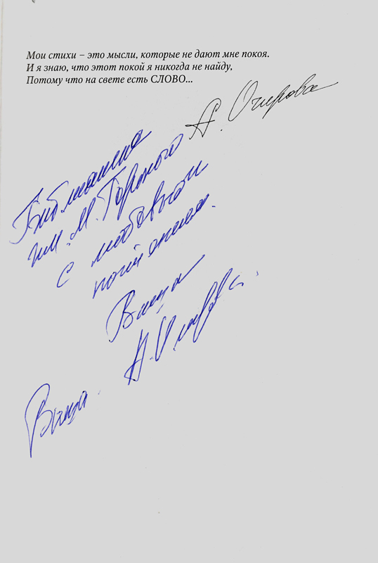 В фонде Рязанской библиотеки имени Горького имеются и другие книги А.В. Очировой: «Сочинения» в трех томах, «В начале мира было слово…», «Пусть недосказанность останется», «Полет над городом вдвоем».