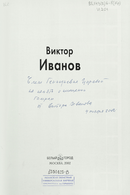 В фонде библиотеки имени Горького в «Коллекции автографов» хранятся книги с автографом Виктора Ивановича. На титульном листе сборника «Русские женщины» имеется следующая надпись: «Рязанским читателям от Виктора Иванова». На титульном листе книги «Виктор Иванов» Виктор Иванович написал: «Елене Геннадиевне Царевой на память о посещении галереи от Виктора Иванова». Царева Елена Геннадиевна в 2008 году возглавляла Комитет по культуре и туризму Рязанской области. Эту книгу она подарила нашей библиотеке.