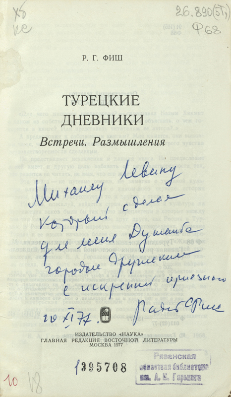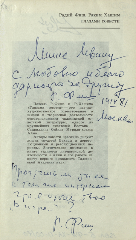 В Рязанской библиотеке имени Горького в «Коллекции автографов» хранятся три книги Радия Фиша с автографами автора. Дарственные надписи адресованы писателю Минелю Иосифовичу Левину, который в свою очередь передал их в дар нашей библиотеке. Автографы можно увидеть на файл-изображениях.