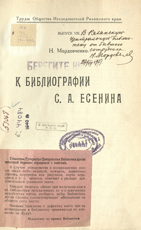 Особой гордостью Рязанской областной библиотеки имени Горького является фонд краеведческих изданий. Почетное место в нем занимают книги с инскриптами и автографами уроженцев нашего края, внесших весомый вклад в отечественную историю и культуру. Дарственную надпись «В Рязанскую центральную библиотеку от бывшего сотрудника. Н. Мордовченко. 27/VII 1927» оставил на титульном листе указателя «К библиографии С.А. Есенина» его автор – блестящий российский литературовед Николай Иванович Мордовченко (1904 – 1951). Труд ученого был издан в 1927 году Обществом исследователей Рязанского края и стал одним из первых аннотированных персональных справочников, где с наибольшей полнотой учтены публикации о С.А. Есенине, вышедшие в течение года после его смерти.