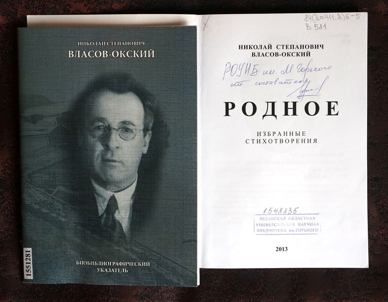 В 2016 году в нашу библиотеку пришла посылка из г. Богородска с книгами нижегородского поэта и писателя первой половины XX века Н.С. Власова-Окского (1888 – 1947): одно прижизненное издание и четыре сборника, вышедшие в 2013–2015 годах. Подарок краеведа В.А. Гурьева – составителя сборников – стал для библиотеки бесценным приобретением, так как в ее фонде не было ни одного издания этого талантливого и почти забытого автора. А ведь у Н.С. Власова-Окского обширное наследие – более двадцати книг, изданных при его жизни в Москве, Нижнем Новгороде и Твери. Дарственная надпись на титульном листе сборника его избранных стихотворений «Родное» (Богородск, 2013 г.), принадлежащая В.А. Гурьеву – редактору, составителю и автору предисловия, – пополнила коллекцию автографов и инскриптов РОУНБ им. Горького.