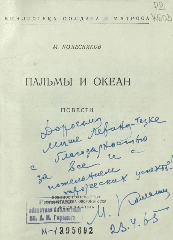В 1962 году уволился в запас в звании полковника и посвятил себя писательскому делу. В 1972 году получил премию Министерства обороны СССР за дилогию «Все ураганы в лицо» и «Без страха и упрека». В «Коллекции автографов» в фонде нашей библиотеки хранится книга Колесникова «Пальмы и океан» с автографом: «Дорогому Мише Левину –тезке с благодарностью за все и с пожеланием творческих успехов!» Дарственная надпись предназначена Минелю Иосифовичу Левину – прозаику, поэту и публицисту.