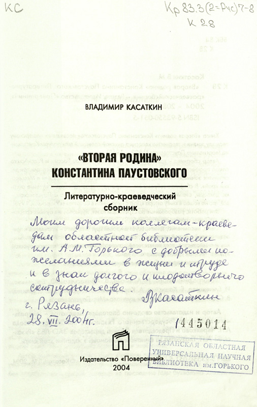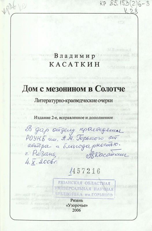 В фонде библиотеки им. Горького в «Коллекции автографов» хранятся четыре издания с личными автографами В.М. Касаткина. Познакомиться с дарственными надписями можно на сканированных изображениях.