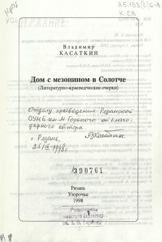 Владимиру Михайловичу Касаткину - 75 лет /Б.В. Горбунов // Материалы и исследования по рязанскому краеведению. – Рязань, 2010. – Т. 24. – С. 420-423.