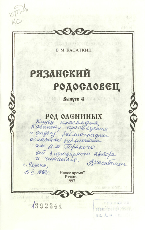 Памяти товарища: Владимир Михайлович Касаткин // Материалы и исследования по рязанскому краеведению. – Рязань, 2011. – Т. 27. – С. 314.