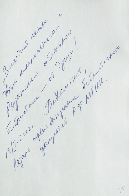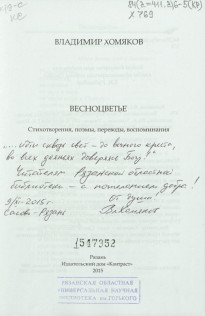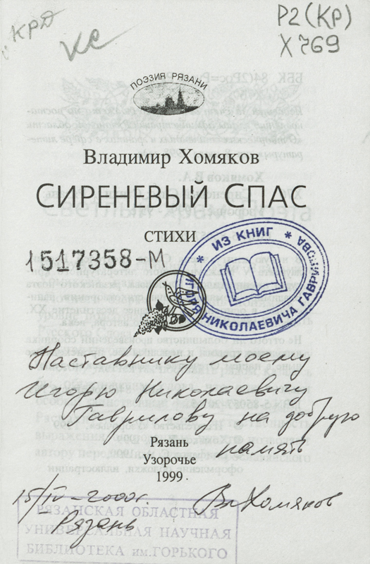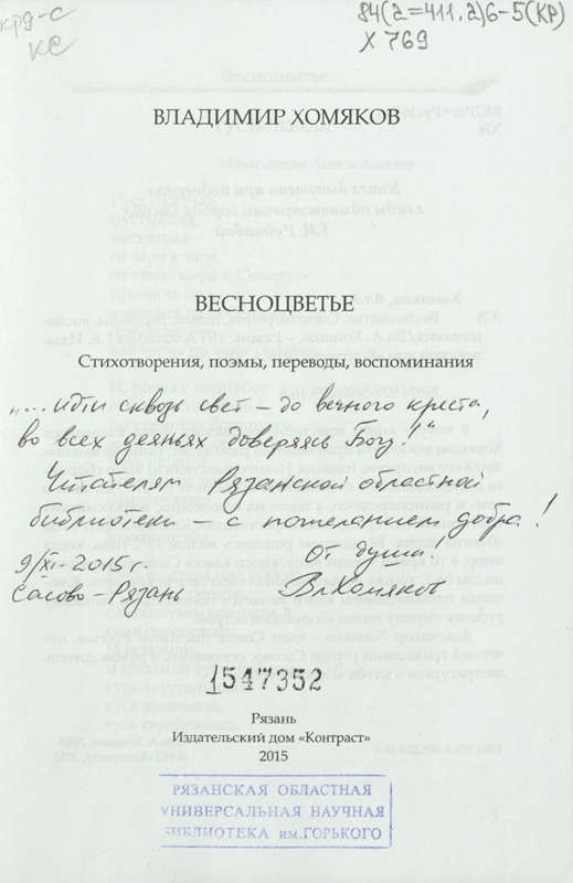 В фонде библиотеки им. Горького в «Коллекции автографов» хранятся пять книг Владимира Хомякова с автографами автора. Дарственные надписи можно увидеть на файл-изображениях.