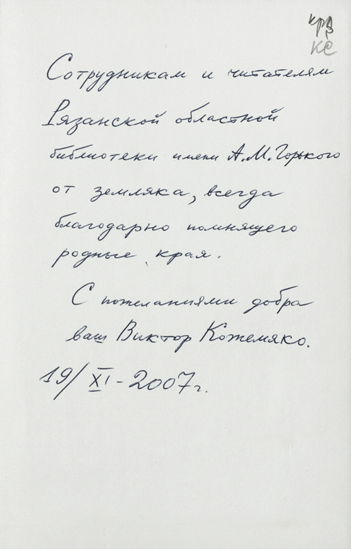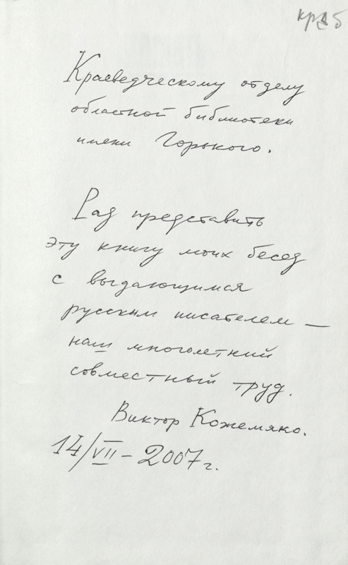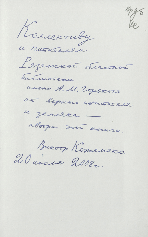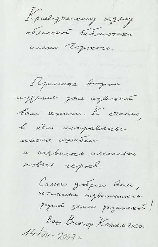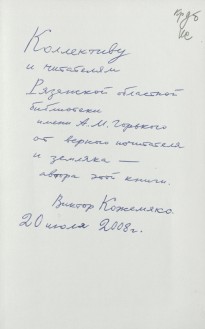В фонде библиотеки им. Горького в «Коллекции автографов» хранится несколько книг В. Кожемяко с автографами автора (смотрите сканированные изображения).