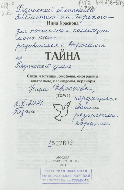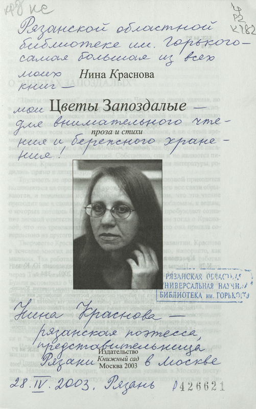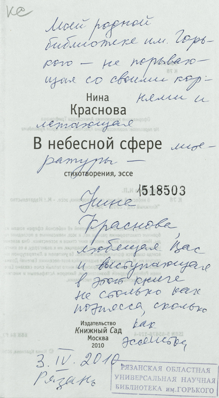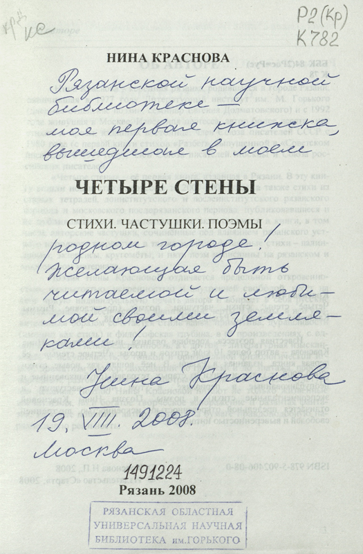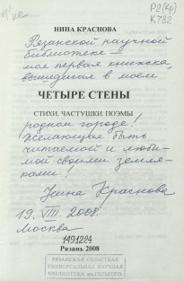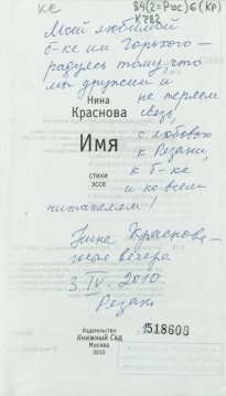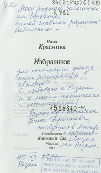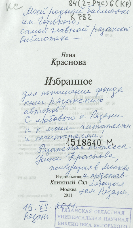 В фонде библиотеки им. Горького в «Коллекции автографов» хранится несколько книг Нины Петровны Красновой с автографами автора. Дарственные надписи на книгах можно увидеть на сканированных изображениях.