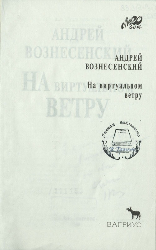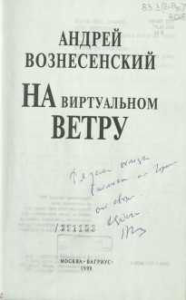 Книга «На виртуальном ветру» имеет экслибрис «Личная библиотека. Н. Краснова» и подарена нашей библиотеке Ниной Петровной Красновой – российской поэтессой, членом Союза российских писателей, которая родилась в нашем городе. «Рязанская писательница, живущая в Москве», – так писала о себе Нина Петровна, автор сборников «Цветы запоздалые», «Такие красные цветы», «Потерянное кольцо», «Имя», «Тайна», «В небесной сфере», «Семейная неидиллия», «Разбег», «Плач по рекам». Перу Нины Красновой принадлежит книга «Храм Андрея на виртуальном ветру». Нина Петровна рассказывает в ней о творчестве и личности своего кумира.