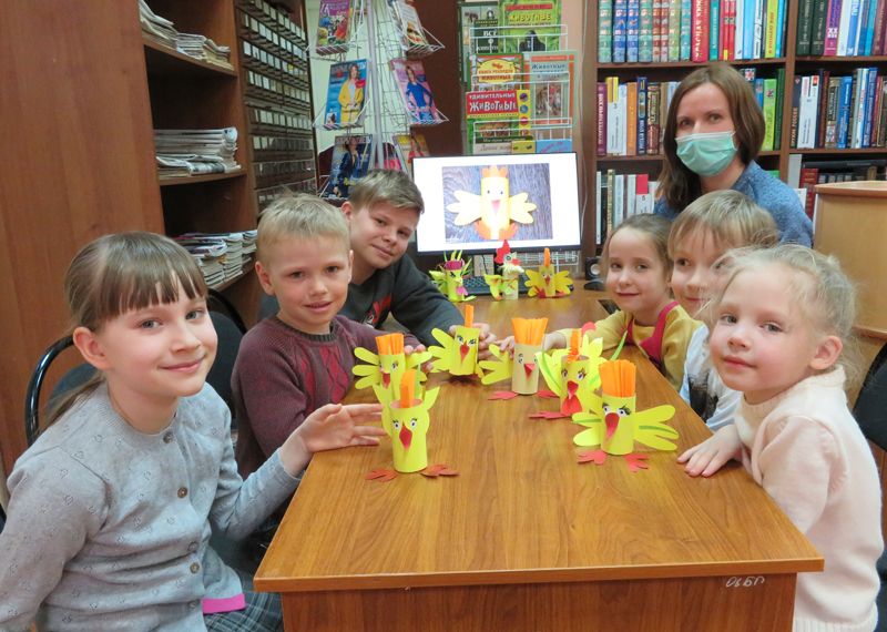 Сотрудники кафедры детской литературы областной библиотеки имени Горького провели мастер-класс по изготовлению бумажной игрушки для участников клуба выходного дня «Домовенок». На занятии, приуроченном к Всероссийской неделе детской книги, дети изготовили из картонных втулок и цветной бумаги знаменитого героя многих сказок – петушка. Эта птица считалась на Руси символом солнца, зари и плодородия.