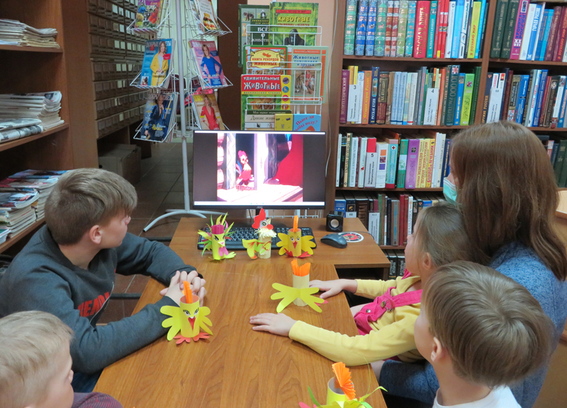 Занятие продолжилось просмотром музыкального мультипликационного фильма по мотивам русской сказки, где верные друзья кот и дрозд спасают доверчивого петушка от хитрой лисы. В завершении встречи юные участники клуба выходного дня получили в подарок от библиотеки книги.