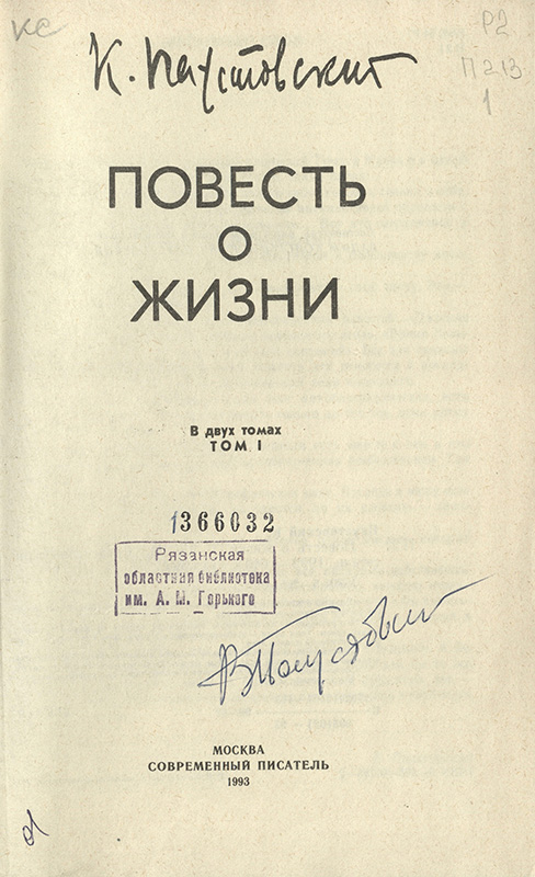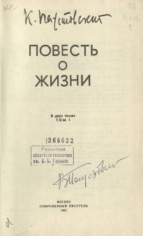 Паустовский К. Г. Повесть о жизни : в 2 т. / К. Паустовский ; [сост., авт. послесл. и коммент. В.К. Паустовский]. Т.1. – Москва : Современный писатель,1993. – 640 с.