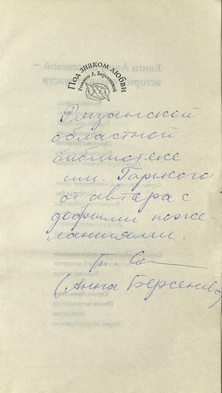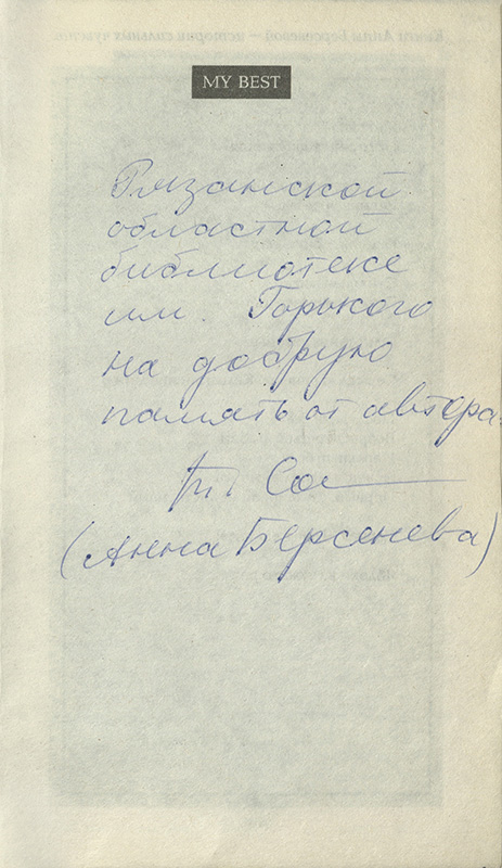 Интересно, что в «Коллекции автографов» Рязанской областной библиотеки имени Горького хранятся три книги с автографами Анны Берсеневой, которые попали в коллекцию в рамках Межрегионального фестиваля национальной книги «Читающий мир» 2018 года. Настоящим подарком для рязанских читателей стала встреча с популярными писателями Анной Берсеневой и её супругом Владимиром Сотниковым, в память о которой она подписала книги своего авторства из фонда нашей библиотеки. Познакомиться с этими изданиями можно в читальных залах библиотеки.