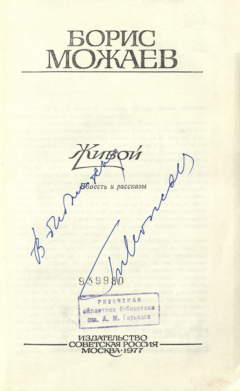 - Можаев Б.А. Живой : повесть и рассказы / Б. А. Можаев. – Москва : Советская Россия, 1977. – 352 с. – (Земля родная).