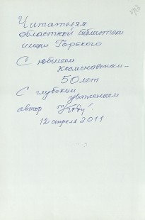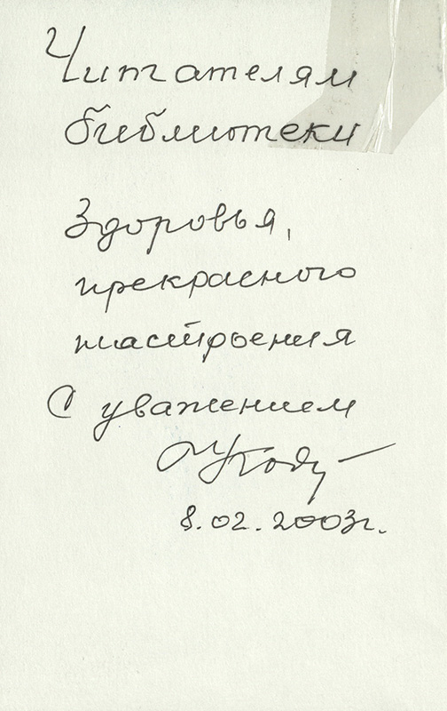 В двух экземплярах книги «Сыновья Великой победы. “Рязанское землячество” в Москве» (2014) автор А.М. Кодылев сделал надписи: «Читателям областной библиотеки имени Горького. С юбилеем космонавтики – 50 лет. С уважением, автор Кодылев 12 апреля 2011», а третий экземпляр адресовал «Олегу Ивановичу Ковалеву с уважением, автор Кодылев 12.12.2014». О.И. Ковалев, губернатор Рязанской области (2008–2017), передал в наш книжный фонд часть своей личной библиотеки.