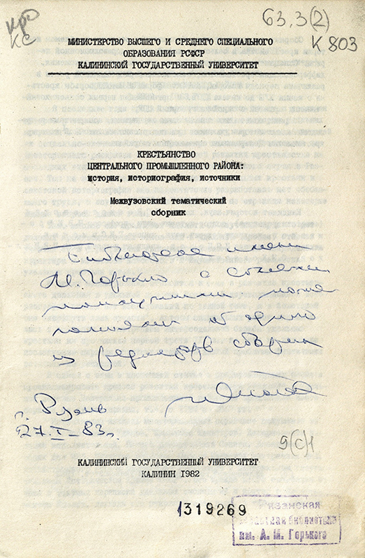 Экземпляр сборника «Крестьянство центрального промышленного района: история, историография, источники» (1982), в котором вышла статья И.П. Попова «“Трезвенное движение” крестьян Калужской губернии в годы первой революционной ситуации», адресован «Библиотеке имени М. Горького с самыми наилучшими пожеланиями от одного из редакторов сборника г. Рязань 27.01.1983 г.».